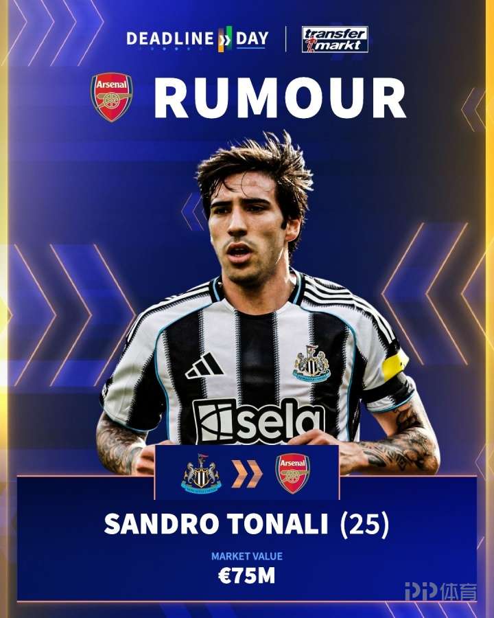 “目前来看,完成交易将非常困难,因为纽卡尚未开绿灯,已经拒绝初步报价。阿森纳仍在努力,他们正全力推动今日完成托纳利交易。”